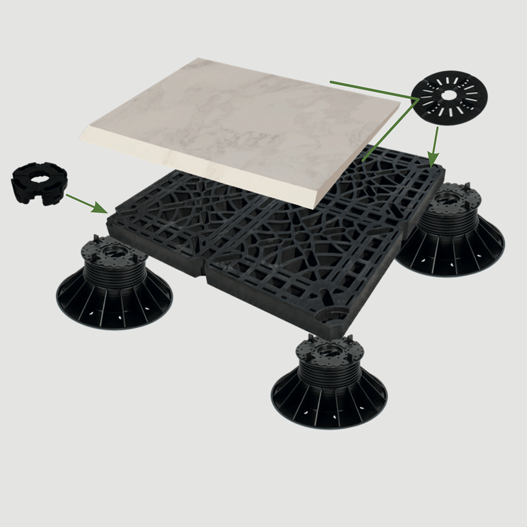 The system is designed to be mounted on any adjustable paving pedestal from the StrataRise range, thus offering the possibility to create floating floors at any required height, even on sloping surfaces. When used with the Hercules 3000 series pedestals all levelling adjustments can be made from above using a special adjustment key.