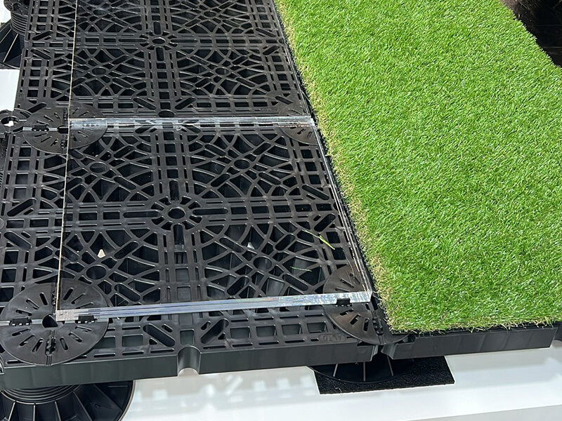 The tiles are designed for use with a special locking connector joint which securely links them together to form a fully integrated, perfectly flat, lippage free surface. The system is designed to be mounted on any adjustable paving pedestal from the StrataRise range, thus offering the possibility to create floating floors at any required height, even on sloping surfaces.